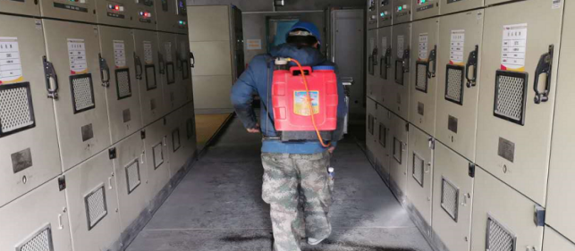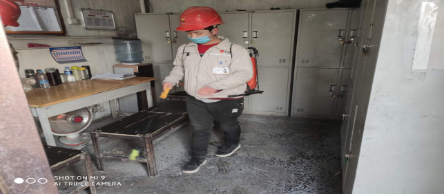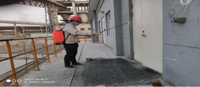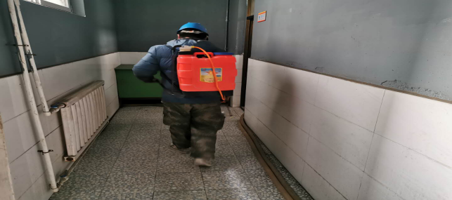 對廠區衛生間消毒。
